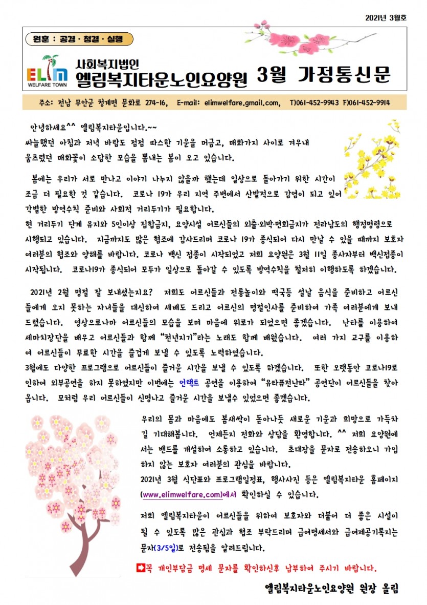 2021년 3월 가정통신문 페이지 정보 작성자 최고관리자 작성일21-03-09 07:22 조회16,700회 댓글0건 관련링크 목록 본문 봄이 성큼 다가온 엘림복지타운노인요양원의 3월 소식지입니다 댓글목록 등록된 댓글이 없습니다. 목록